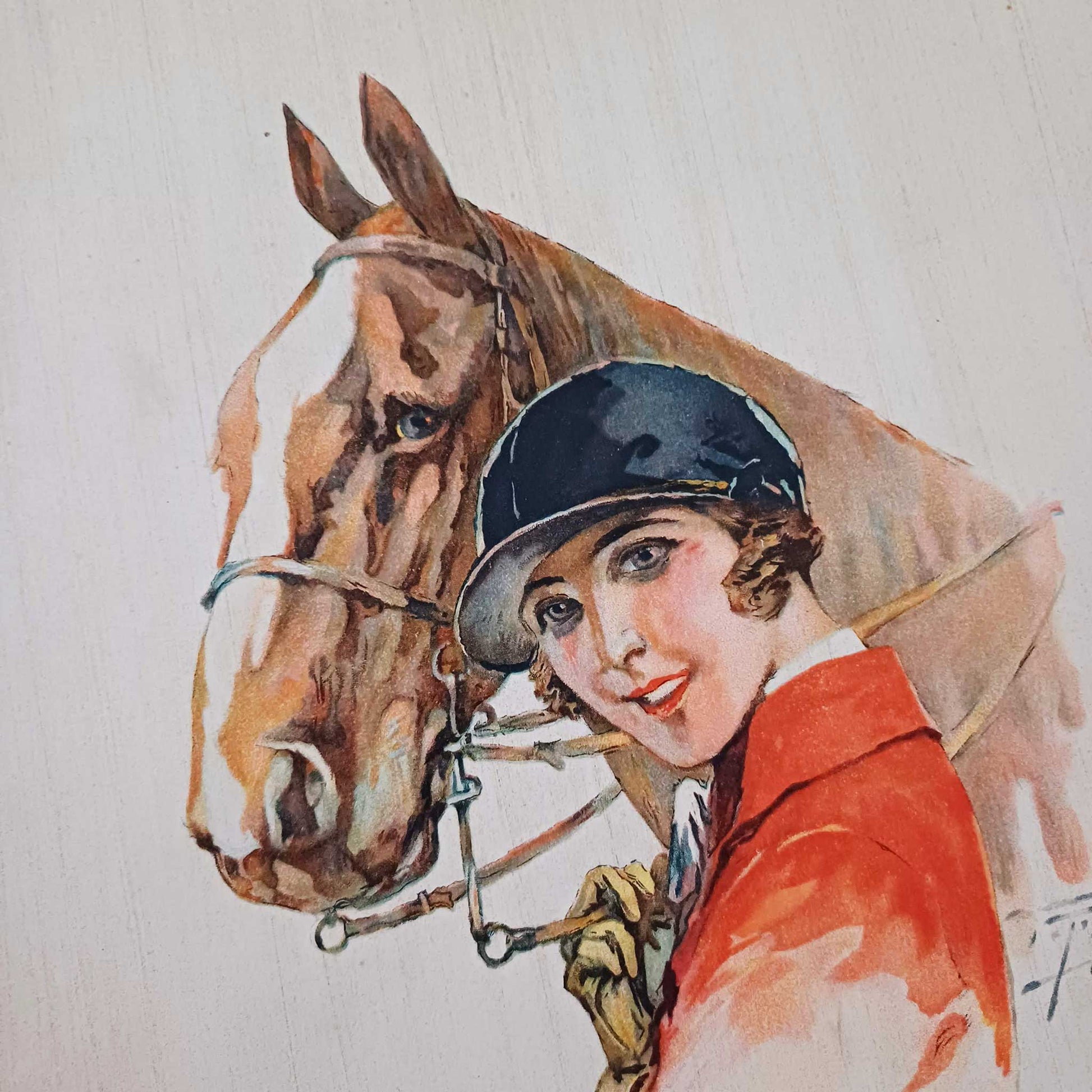 Joli carton publicitaire illustré pour les magasins Adolphe Delhaize & Cie, à l’époque de Bruxelles maritime. Une belle scène équestre typique de l’iconographie publicitaire du début du XXe siècle, avec de jolies couleurs et une composition élégante. Bel objet décoratif et de collection.