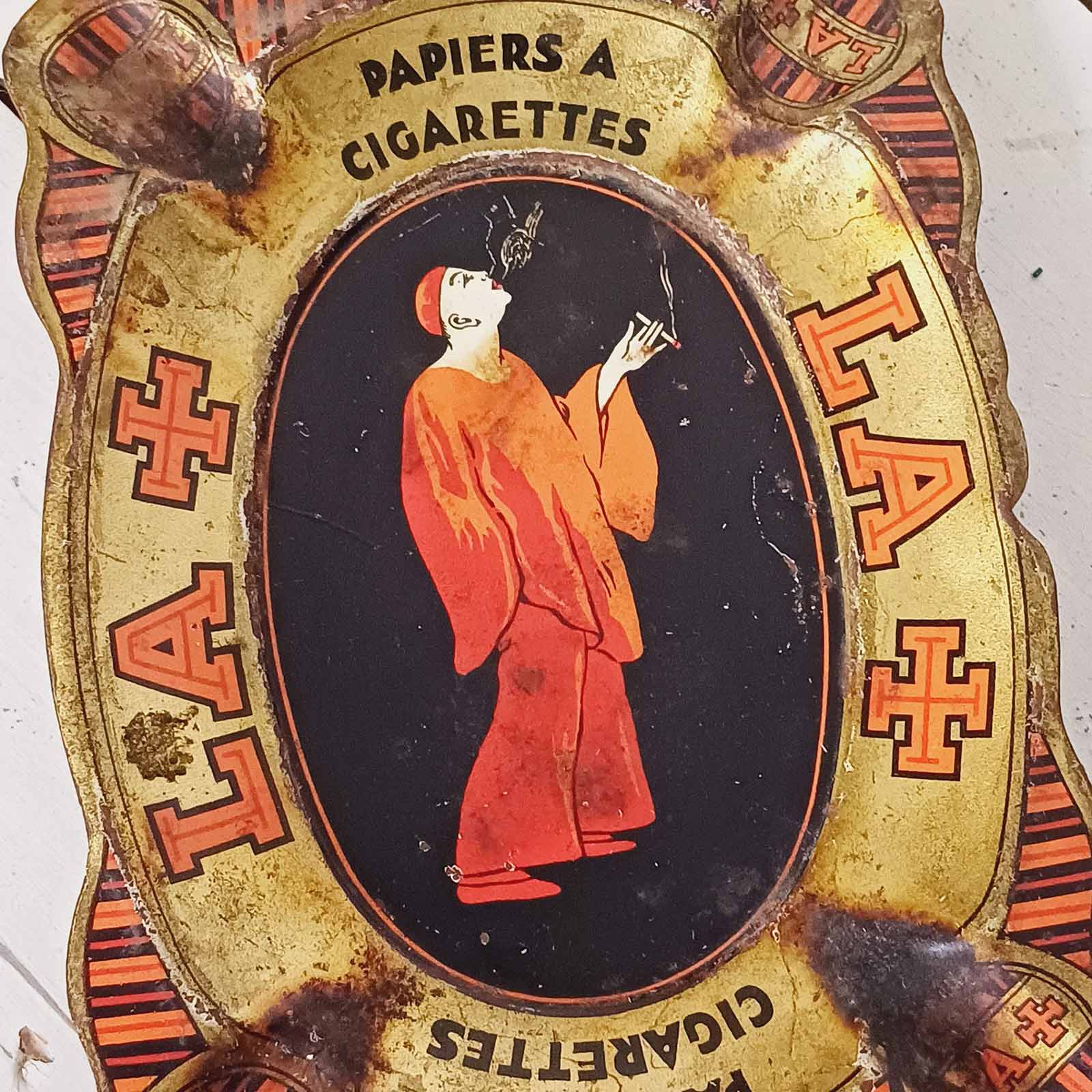 Cendrier ancien en tôle lithographiée Rizla, daté des années 1920, orné d’un superbe visuel signé J. Spring, figure emblématique de l’illustration publicitaire de l’époque. Ce modèle LA+ est un grand classique de la tabaciana, recherché pour la qualité de son graphisme et sa forte présence visuelle. L’objet a clairement vécu : traces d’usage, marques du temps et brûlures témoignent de son histoire et renforcent son authenticité. Un cendrier de caractère, incontournable pour tout collectionneur de publicités anciennes ou d’objets liés au tabac.
