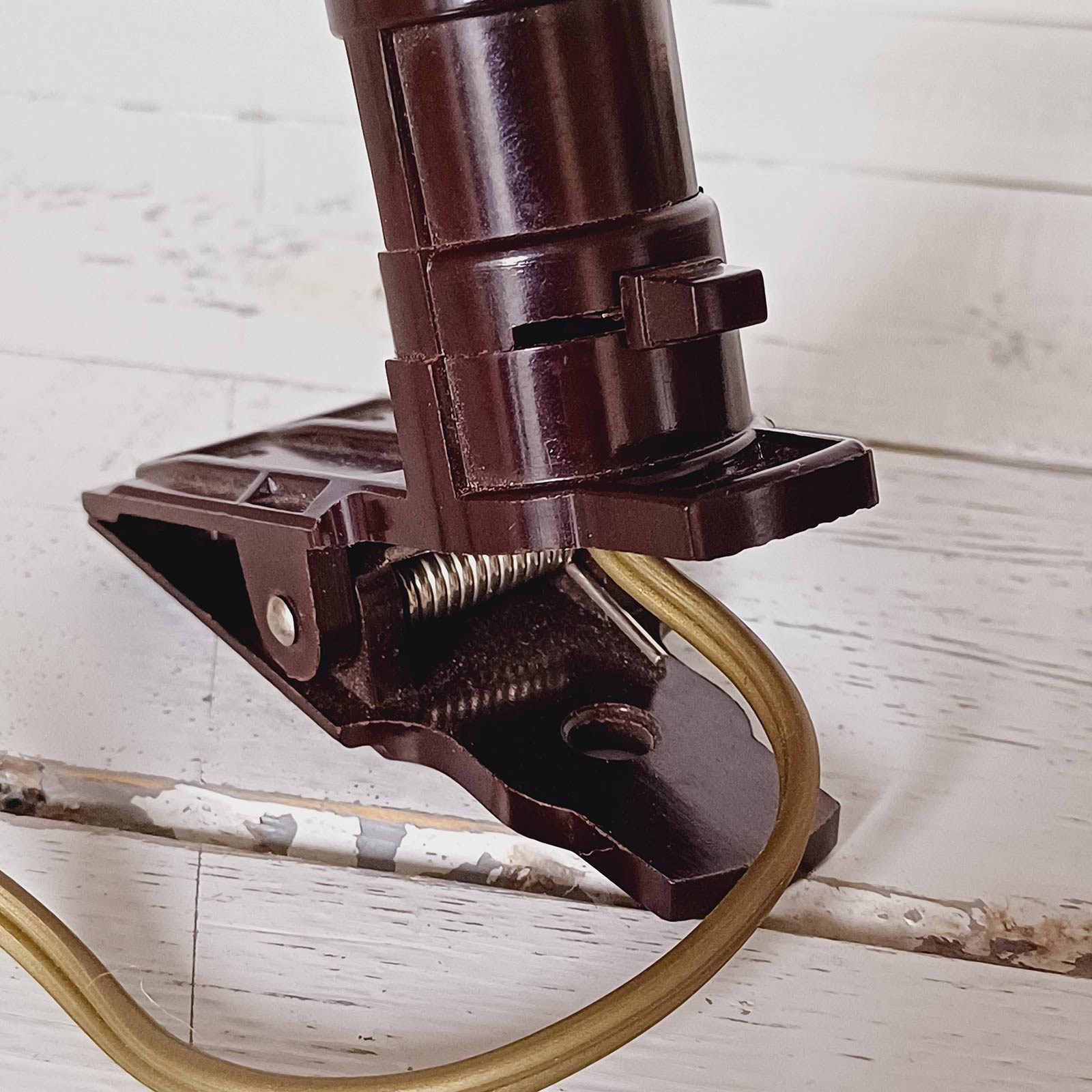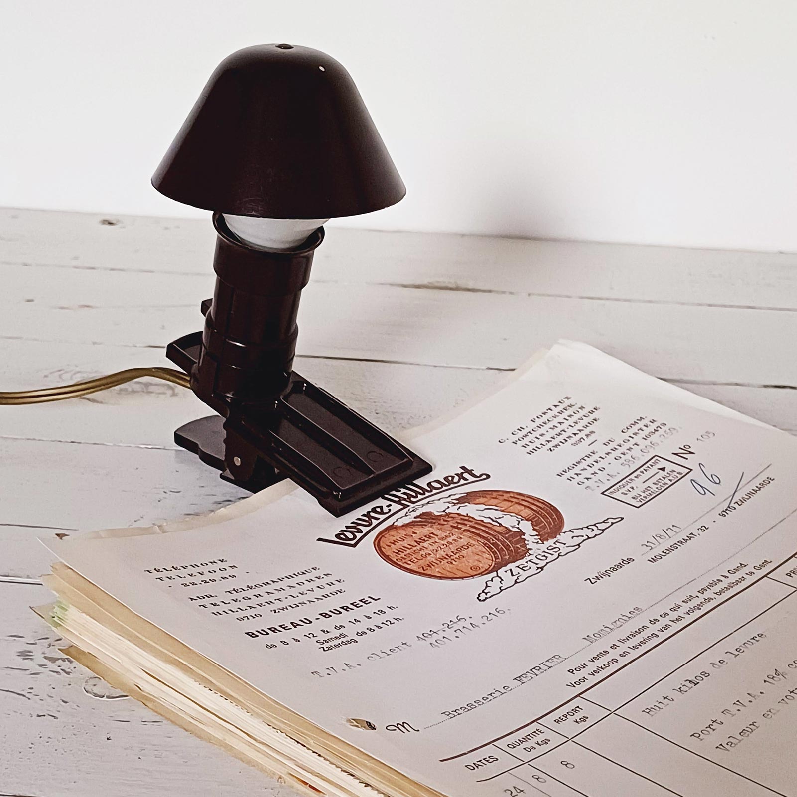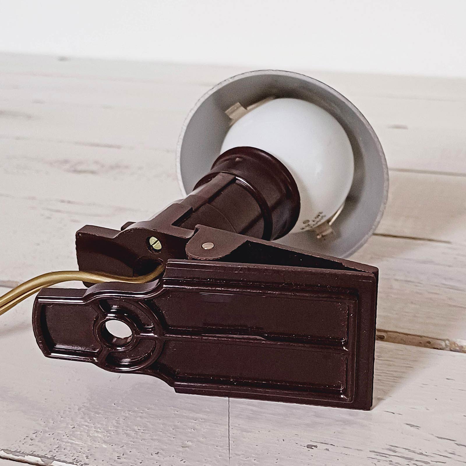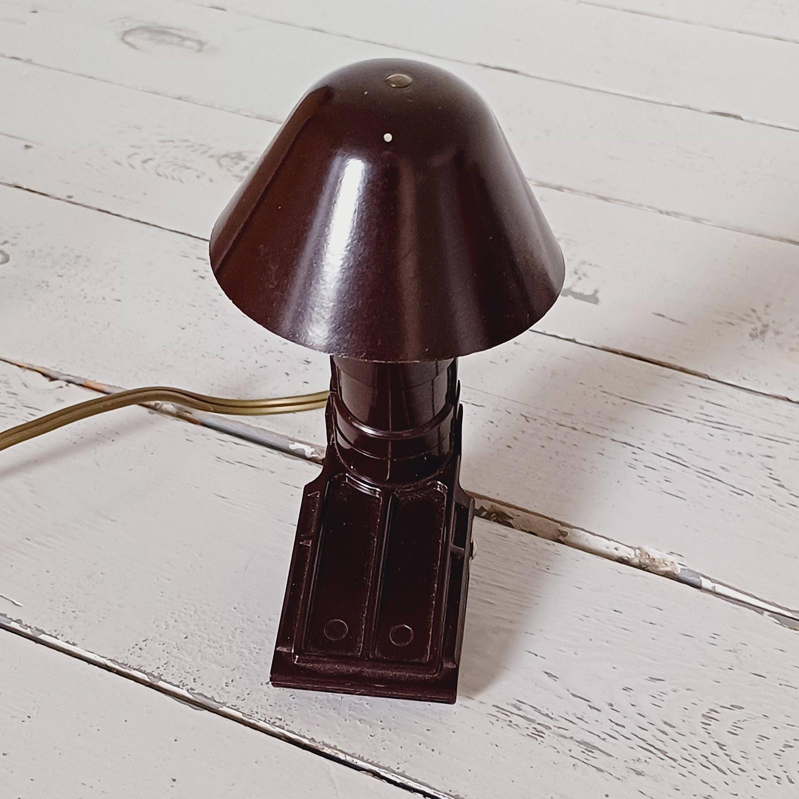 Charmante petite lampe champignon à pince en bakélite, typique du design utilitaire du milieu du XXᵉ siècle. Compacte et légère, elle s’accroche facilement grâce à sa pince intégrée et diffuse une lumière chaleureuse. Sa forme arrondie et son matériau emblématique lui confèrent un véritable caractère vintage. La lampe fonctionne parfaitement, et son esthétique rétro en fait une belle pièce décorative pour un bureau, un atelier ou une étagère. À noter : les documents papier visibles sur une des photos ne sont pas inclus.