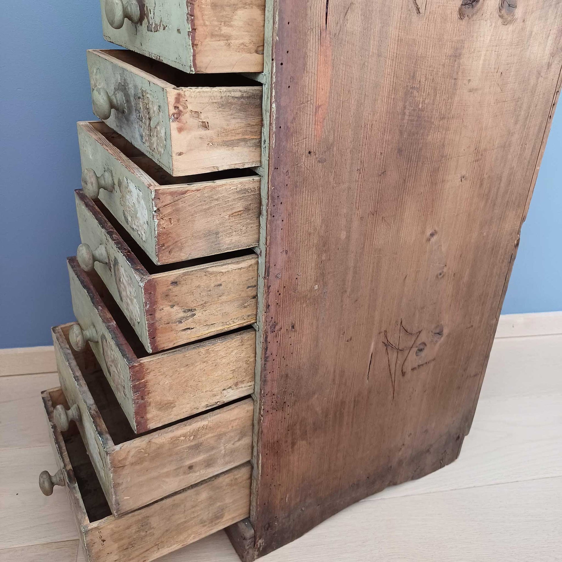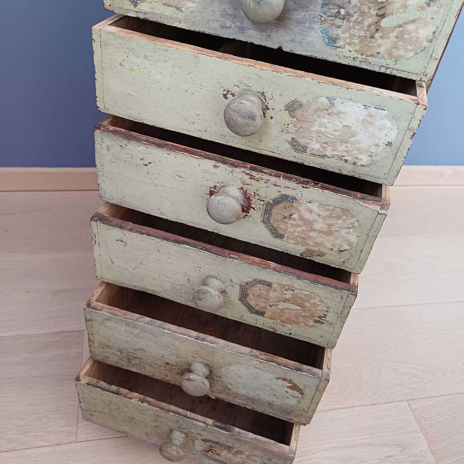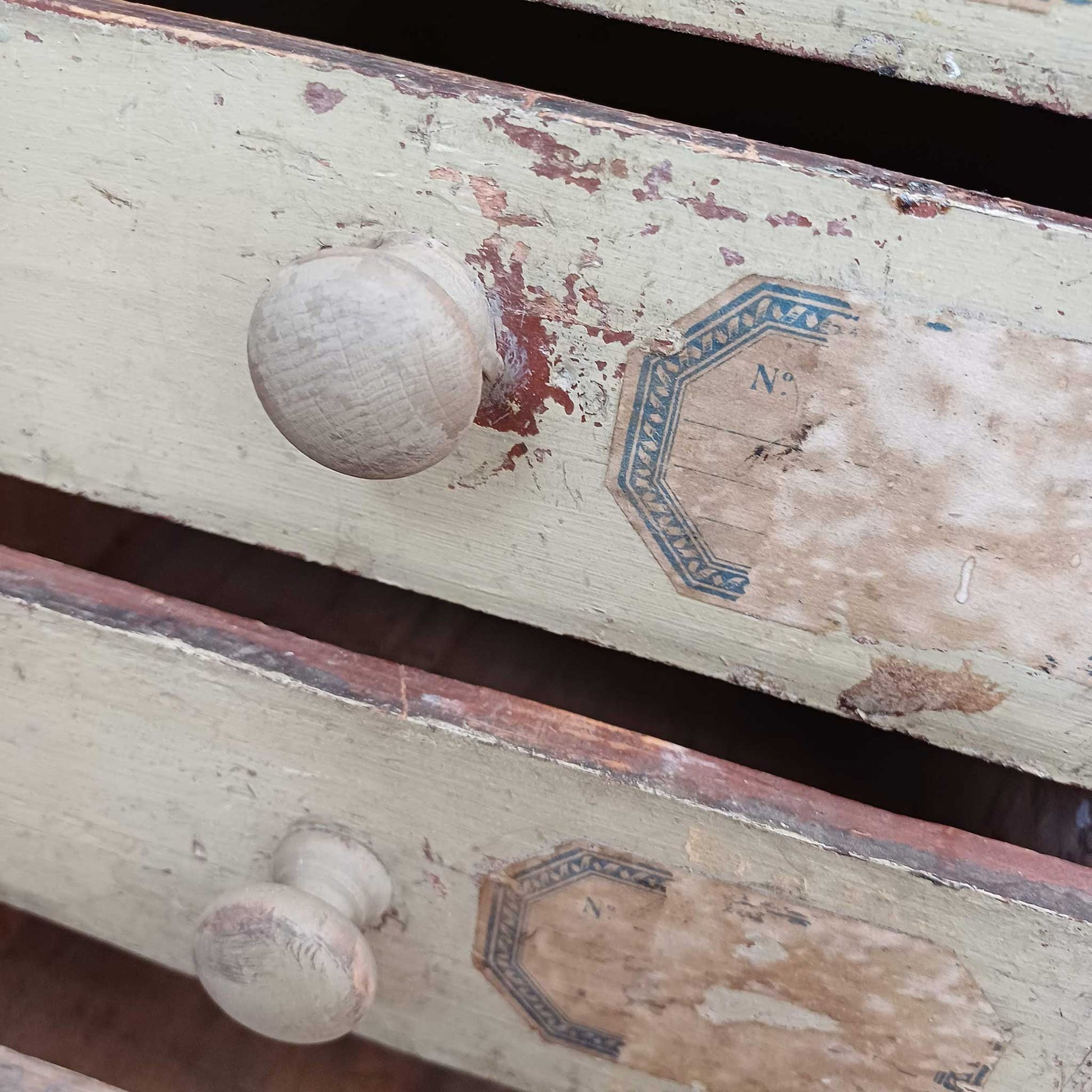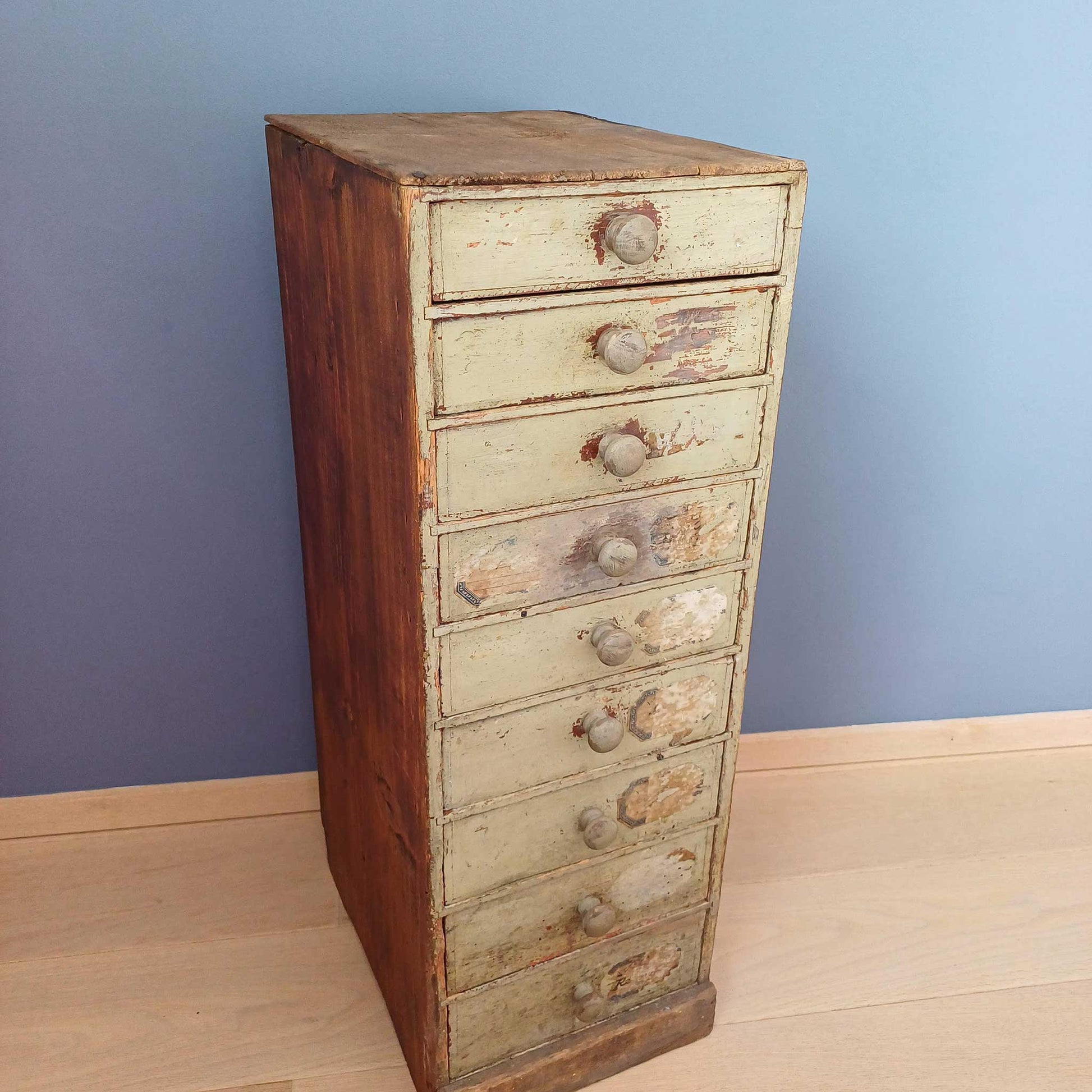 Ces petits meubles de rangement deviennent de plus en plus difficiles à croiser, mais ils gardent un charme incomparable. Celui-ci, doté de 9 tiroirs, se distingue par sa superbe patine d’atelier, ses restes d’étiquettes, et toutes ces traces du temps qui lui confèrent un caractère authentique.