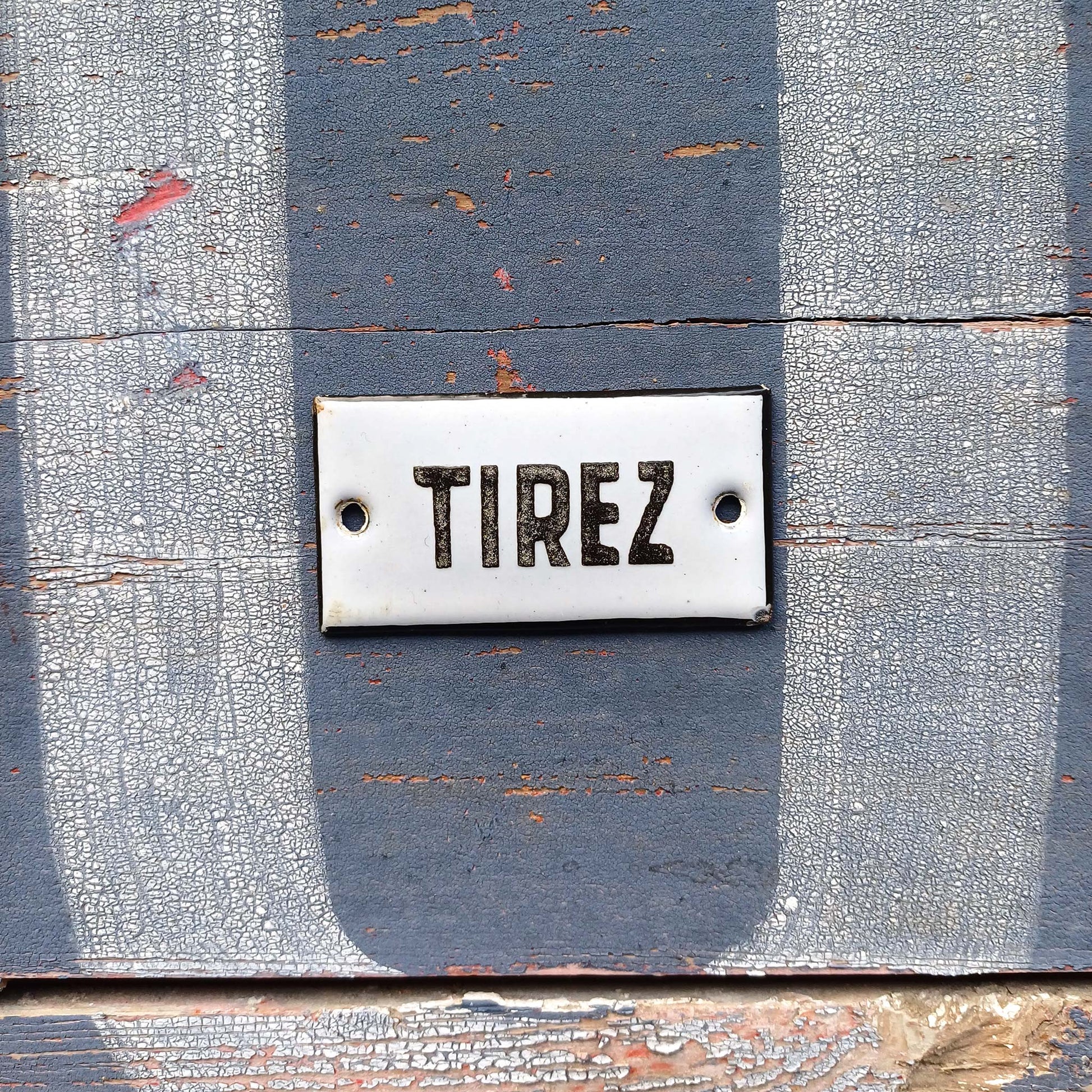 Ce modèle “Tirez” est en très bel état, avec un émail bien brillant et une typographie élégante typique de l’époque.