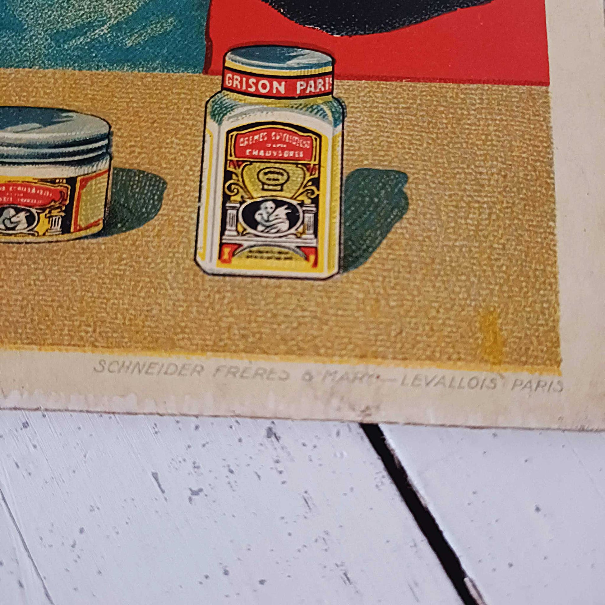 Je vous propose ce carton publicitaire pour les pâtes et crèmes Grison, célèbres produits d’entretien pour chaussures. Illustration typique du début XXe siècle, aux couleurs vives et au graphisme très expressif. Une belle pièce décorative et de collection.