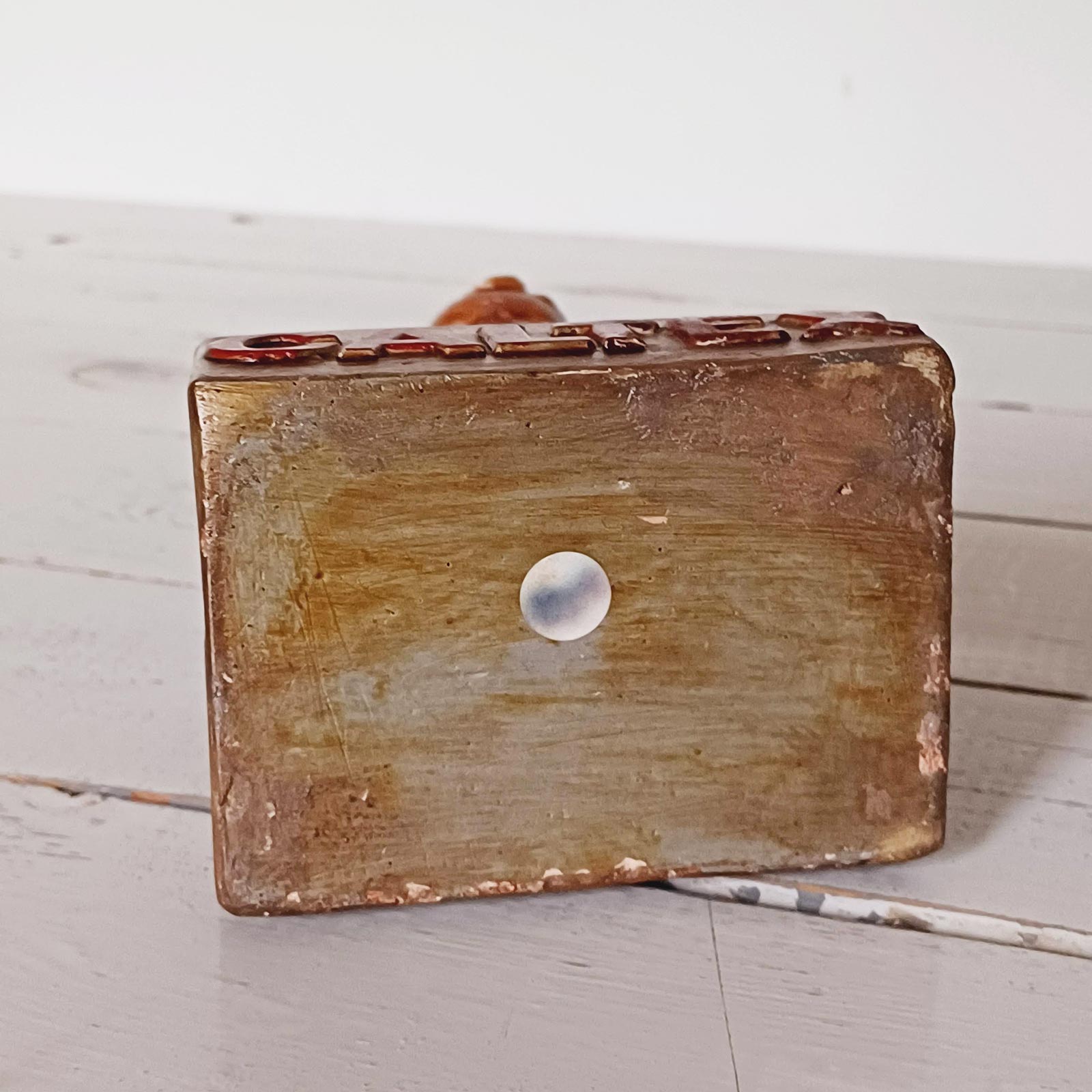 Charmante statuette en plâtre représentant un petit pompiste aux couleurs vives, montée sur un socle portant l’inscription Caltex en relief. Mesurant 20 x 8 x 10,5 cm, elle présente un bon état général avec de légères retouches harmonieuses, presque invisibles. Le personnage porte une marque de fabricant dans le dos, mais il est difficile d’en garantir l’authenticité complète. Cela n’enlève rien à son charme : cette pièce reste un bel objet publicitaire décoratif, idéal pour une vitrine dédiée au thème du garage, aux huiles automobiles ou aux stations-service d’époque.