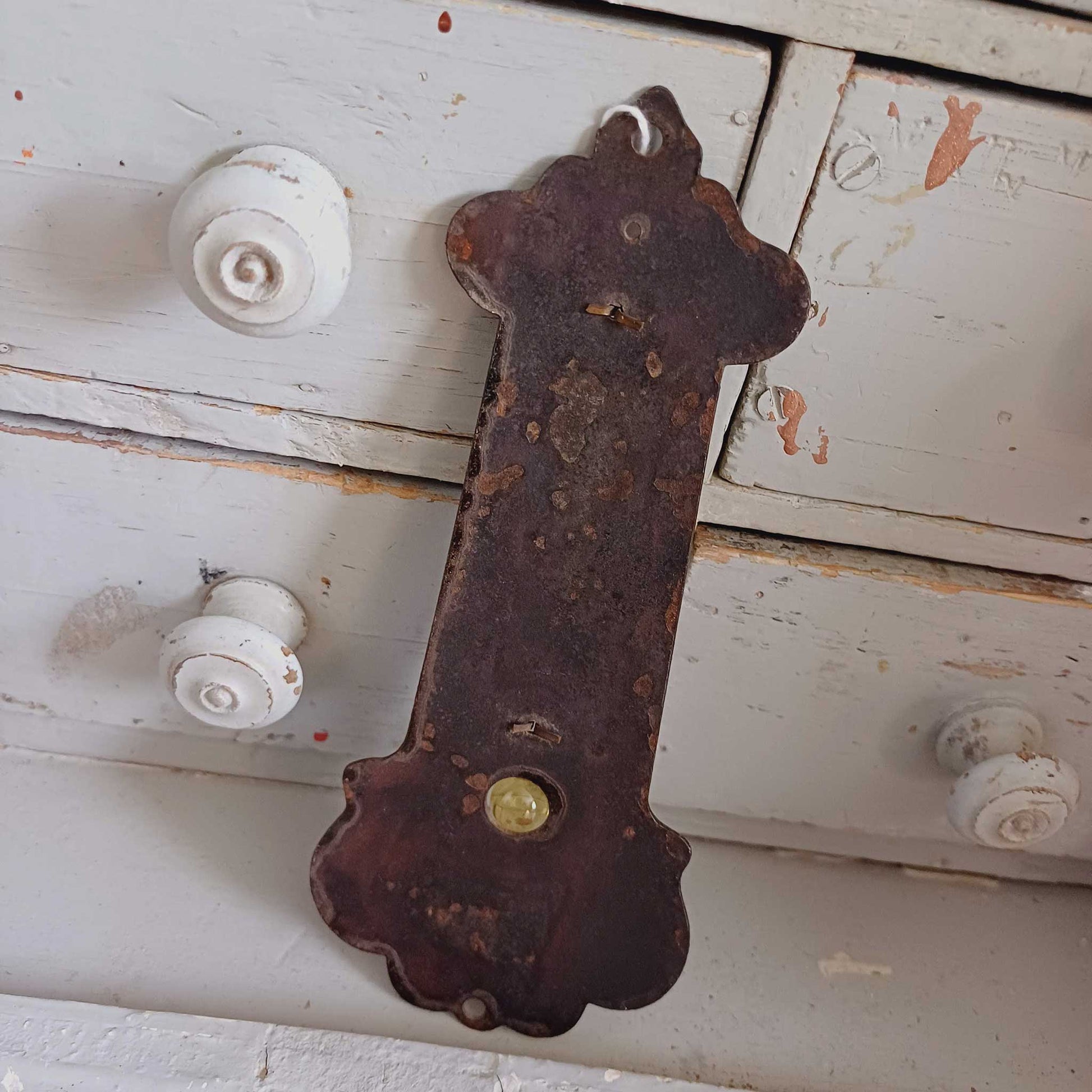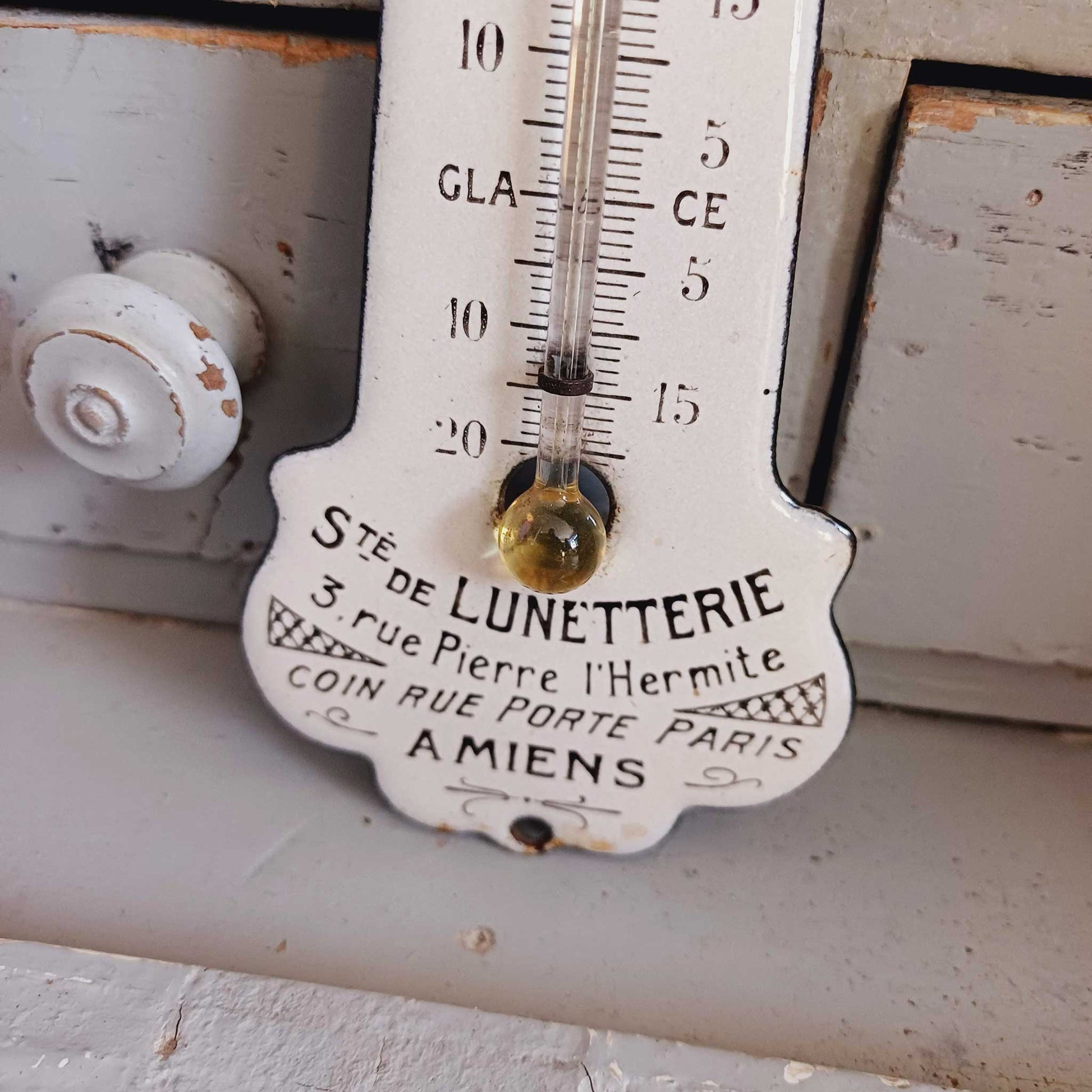 Ancien thermomètre en tôle émaillée réalisé pour la Société de Lunetterie, située 3 rue Pierre l’Hermite – Coin rue Porte Paris – Amiens.